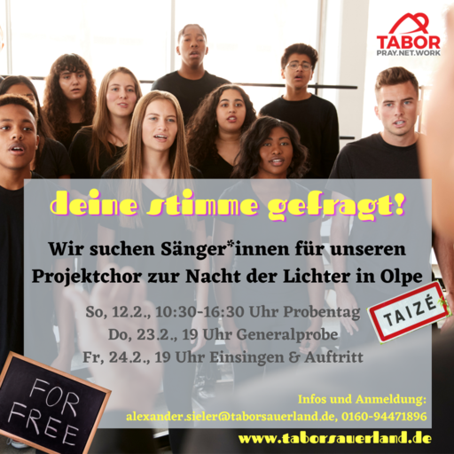 Das Besondere: Es wird ein Projektchor zur Unterstützung der besonderen Taizé-Gesänge unter der Leitung von Hannah Tillmann ins Leben gerufen. Dazu sind alle Interessierten, unabhängig von Alter und Vorerfahrung, herzlich eingeladen. Am Sonntag, 12.02., findet dazu von 10:30-16:30 Uhr ein Probentag in Olpe statt, am Donnerstag, 23.2. um 19 Uhr die Generalprobe in der St.-Martinus-Kirche.
