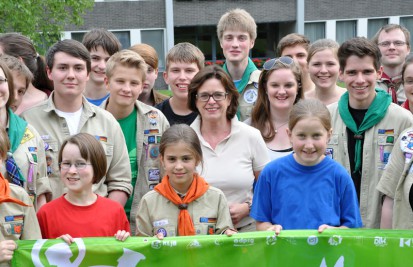 „Euch schickt alle der Himmel“, findet Ute Schäfer, Ministerin für Familie, Kinder und Jugend, Kultur und Sport. Sie motiviert die drei Detmolder Jugendgruppen beim Projektstart auf dem Kupferberg, wo ein Erlebnispfad entstehen soll. Mit dem Vorstand des BDKJ-Diözesanverbandes und des Kreisverbandes Bielefeld setzt sie die Idee gleich in die Tat um: ein gemeinsames Spiel begeistert nicht nur die vielen Jugendlichen. „Ein tolles, neues Spiel. Das wäre doch mal eine Idee für den Landtag“, scherzt die Ministerin. Sie hofft, dass dieses Projekt viele Nachahmer findet. Die Projektleiter Daniel Thewes (17) und Miriam Kampel (18) von den Pfadfindern nehmen die Herausforderung der nächsten Stunden an: „Wir sind optimistisch, dass wir mit der großen Gruppe einen schönen Parcours bauen können.“